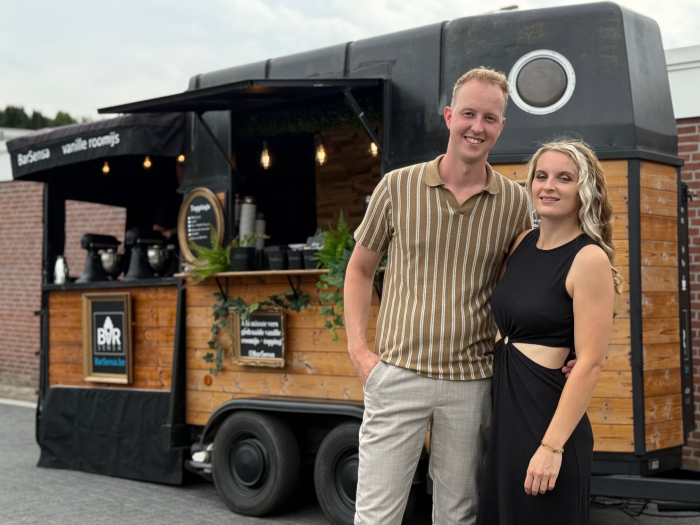 BarSensa's zelf omgebouwde paardentrailer ijsbar & koffiebar. Volledig op wielen, ideaal voor buiten, maar kan ook in grote, hoge ruimtes makkelijk binnen geplaatst worden. Deze truck bevat een elektrische mover waardoor deze op moeilijk bereikbare plaatsen zonder voorwagen heel precies kan geplaatst worden.